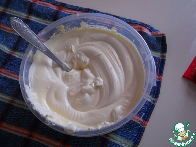4. Взбиваем белки, добавляем растворенный желатин, размешиваем и понемногу добавляем масляный крем. Взбиваем.