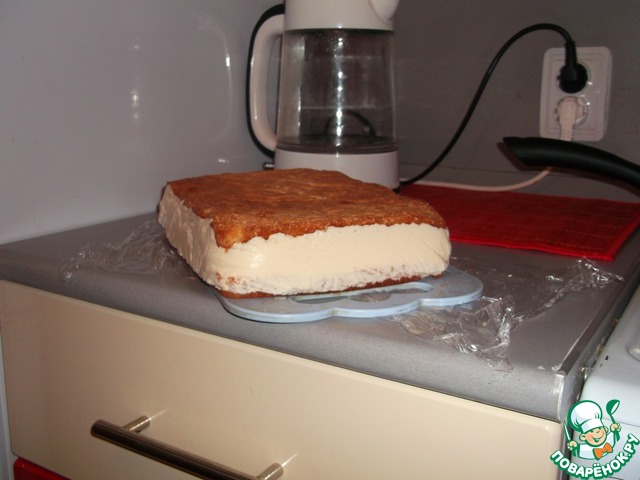 5. Далее собираем торт. Уложила в форму корж, заливаем полученным кремом. Сверху укладываем второй корж. Ставим в холод. Через несколько часов достаем из холодильника и освобождаем из формы. У меня вышло так: