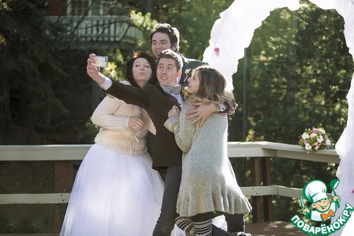 . Другая проблема - сада нету (который был на фото), кругом горы. Наша терраса стояла прямо на небольшом склоне. Думали уже ехать искать снег, и местечко подходящее, но потом поняли что тогда придется пожертвовать многими вещами. В итоге, решили делать церемонию на террасе, которая на участке. Получилось очень даже мило, как будто над обрывом, да ещё и терраса такой идеальной формой оказалась. А вот в день свадьбы я проснулась очень грусной, потому что вместо снега, было солнце и очень тепло. Но потом решила что никакая погода не испортит мне праздник, тем более солнце