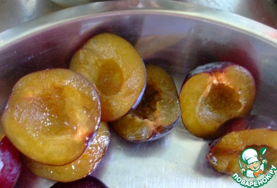 И сверху, не насилуя и не вдавливая....сливы, обычно у меня получается 35-38 половинок.