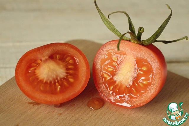 А я бы не убирала вторую половинку, как Светик посоветовала, а разрезала бы ее на половинки и положила на "спину" друг за друга, да чтоб задняя торчала правее к основной помидоринке