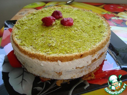 С интересом ждала момента разрезания коржа - получится он зеленым или нет, т.к. делала из обычных фисташек, которые к тому же были соленые - ну нет у нас других. Разрезала корж и