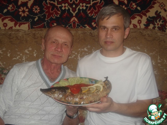 Итак, фото № 1. Муж двоюродной сестры моего мужа и мой муж хвастаются фаршированной щукой.