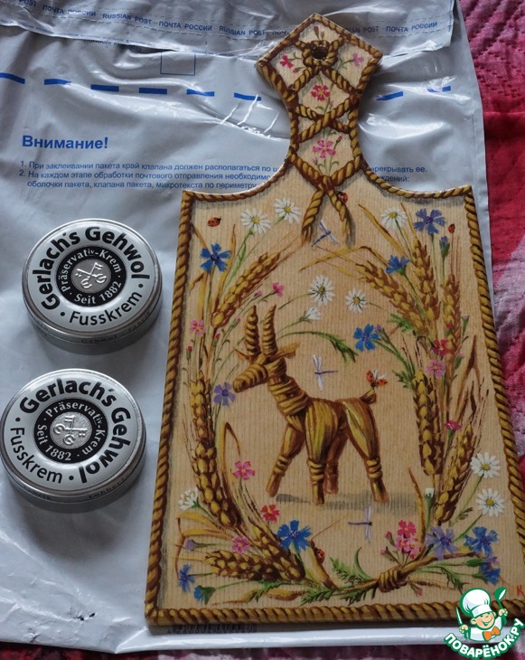 А вот это я выиграла на дружественном нам сайте в кулинарном конкурсе, доска для хлеба ручной росписи и очень классный крем для уставших ног.