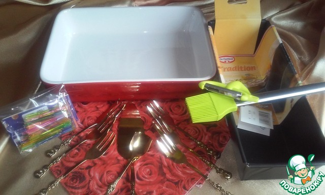 Вот такие замечательные и очень нужные мне (как это Виолушка догадалась?) формочки, кисточка , овощечистка-декоратор, очень красивые шпажки, набор для торта, который расположился на восхитительно красивых салфеточках.