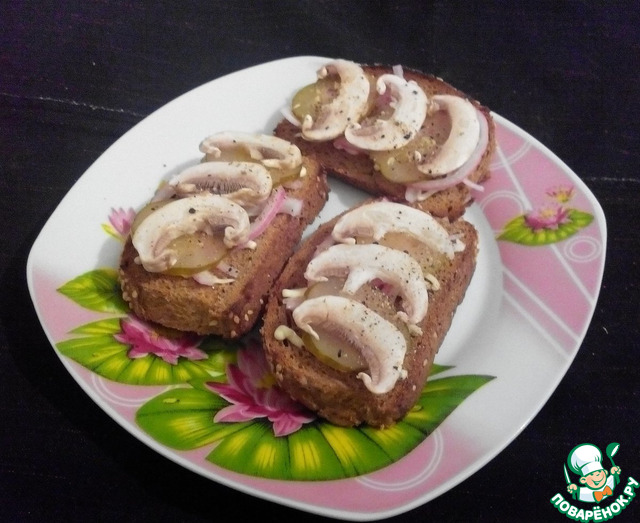 Бутерброды восхитительные. Очень вкусно. Можно было без грибов и так очень вкусно. Черный хлеб с лучком и огурчиком это просто песня.