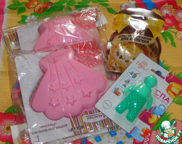 Очень красивые нежно-розовые силиконовые формочки для выпечки "Ракушки", удобный "человечек" для заваривания чая, шоколадные капли для выпечки.
