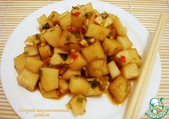 Острый маринованный дайкон по рецепту Наташеньки Хироко - в меру острая,ароматная приготовленная мной с использованием соевого соуса закуска,нам пришлась по вкусу.