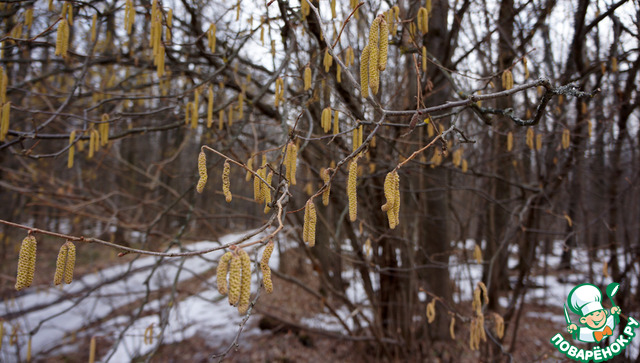У нас через лес проходит газопровод, открытая широкая полоса, там снега почти нет, хотя на северной стороне еще лежит и даже лыжника мы видели, орешник цветет вовсю