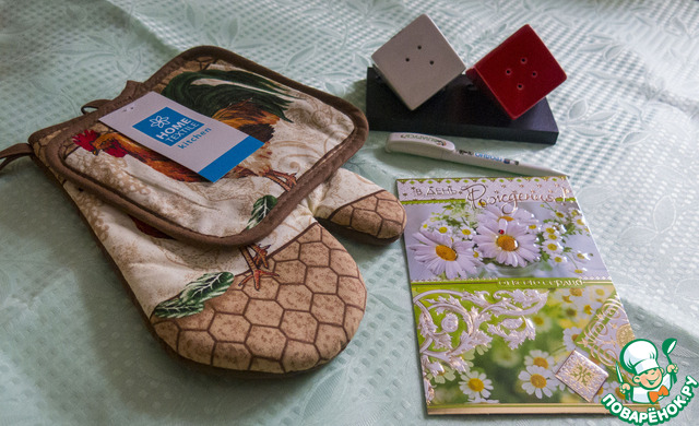 Красивые прихватки, ручка с названием любимого города в Белоруссии (я там была много раз и надеюсь, у нас будет не одна реальная встреча с Маришей) и оригинальная солонка с перечницей!!