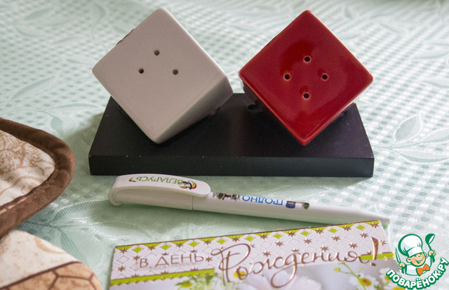 Красивые прихватки, ручка с названием любимого города в Белоруссии (я там была много раз и надеюсь, у нас будет не одна реальная встреча с Маришей) и оригинальная солонка с перечницей!!