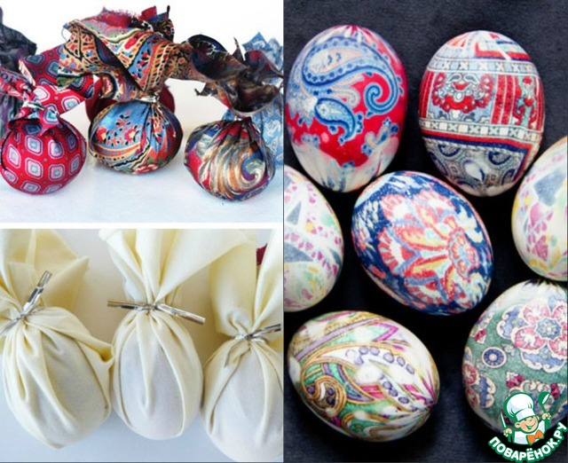 Поскольку, шёлк прекрасно передаёт свой цвет, невозможно этим не воспользоваться для создания интересного окрашивания. В качестве основного материала можно использовать старые галстуки, шейные платки или просто отдельные отрезки ткани. В кипящую воду с уксусом погружают яйца, обёрнутые шёлком, а сверху куском белой ткани. Таким образом, на скорлупе отпечатается рисунок, который можно дополнить, например, приклеив бисер, бусинки, кружево, бумажных бабочек. Ткань лучше выбирать поярче, поскольку готовый рисунок получится несколько тусклым.
