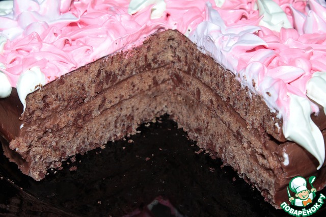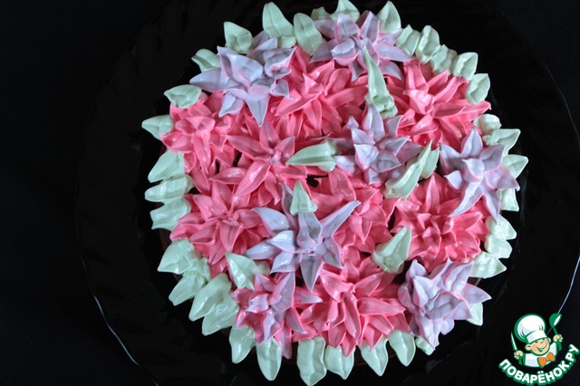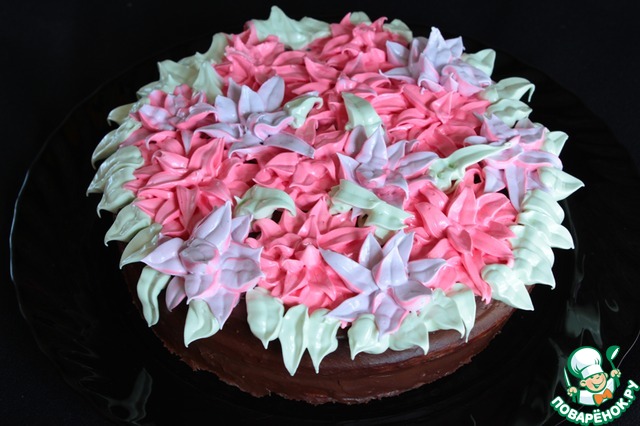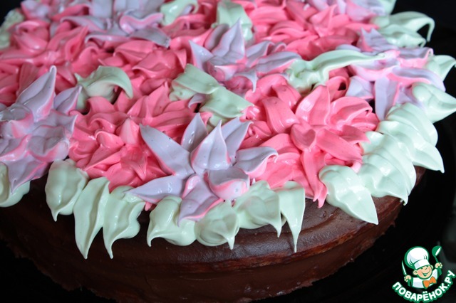 Ну, а для оформления я использовала Крем "Мокрое безе" Елены LEKA250887 Очень долго я настраивалась на оформление торта белковым кремом и решусь очередной раз на такое с моими условиями теперь, видимо, не скоро. Накануне попался мне в магазине дешевый китайский кулечек с насадками, им и воспользовалась. Первый опыт оформления, конечно, хотелось по-другому, но что получилось