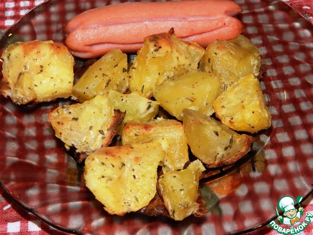 Однако, у меня картошечка моя была НЕ сухая, а очень вкусная и пикантная (на 6 средних картофелин 0,5 ч.л. соли и из приправ хмели-сунели). Фольгу всё-таки смазала сливочным маслом. Через 20 минут положила на картошку сосики и выпекала ещё 15 минут