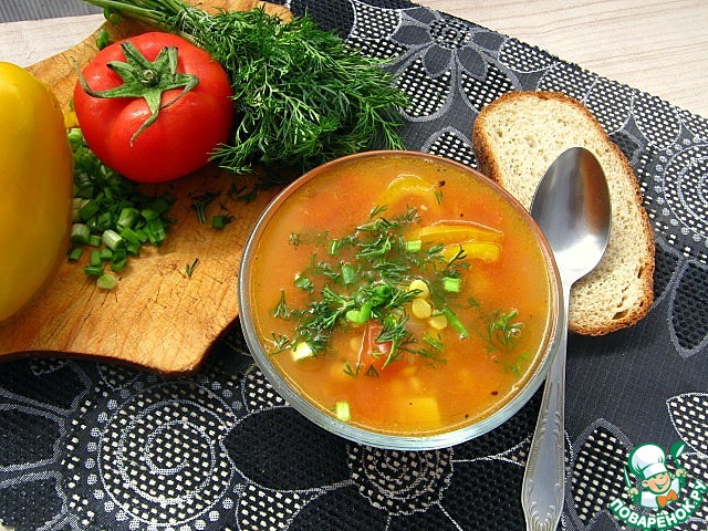 Варила на овощном бульоне - получился сытный, яркий ,вкусный суп. И, да простит меня автор рецепта, вместо замороженного горошка использовала пророщенный маш -по вкусу от горошка не отличишь, а пользы несомненно больше. Суп прочно прописался в нашем меню