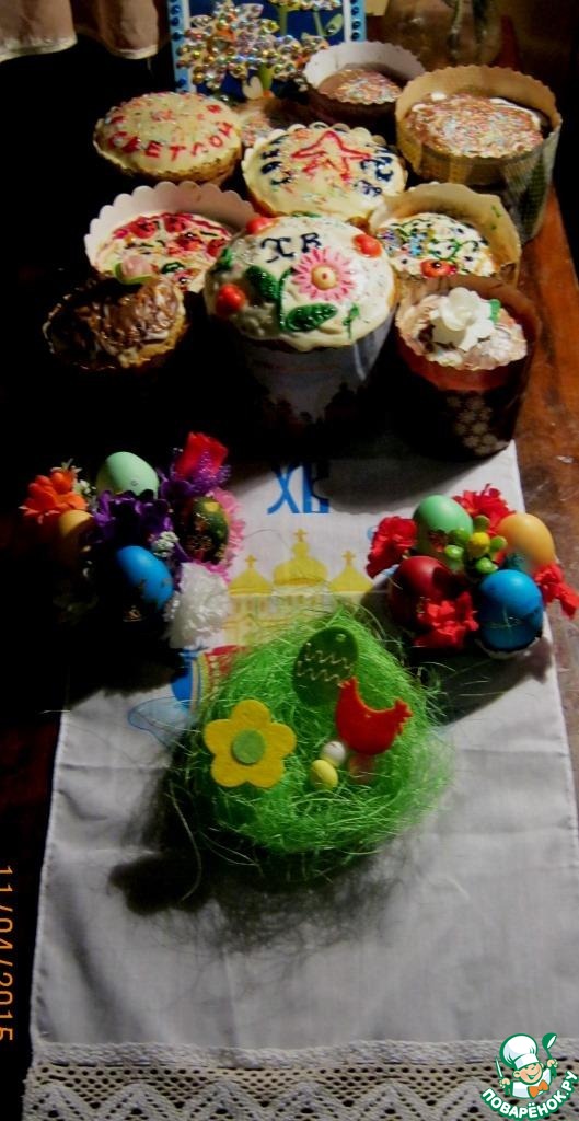 Вот уже на протяжении нескольких лет у нас в семье заведено [cut] каждую Пасху печь куличи самим и украшать их! В субботу, когда все яйца украшены, куличи испечены мы накрываем пасхальный столик: стелим специальный пасхальный рушник, на него ставим украшенные яйца, куличи, пасхальную композицию.