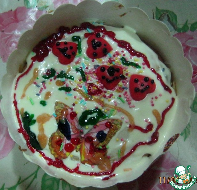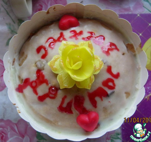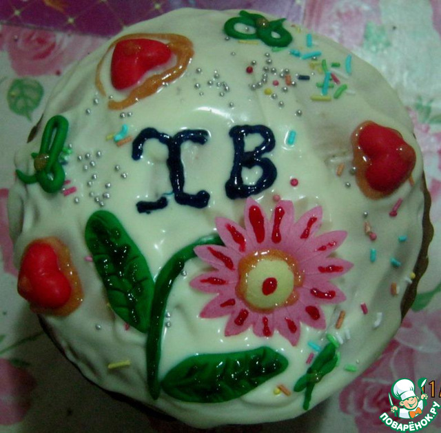 Это наш заглавный кулич! Его украшали сахарной помадкой со вкусом лимона, гелевыми карандашами-красителями. Сам цветочек сделан из рисовой муки, а стебелек и листики делали из мастики.