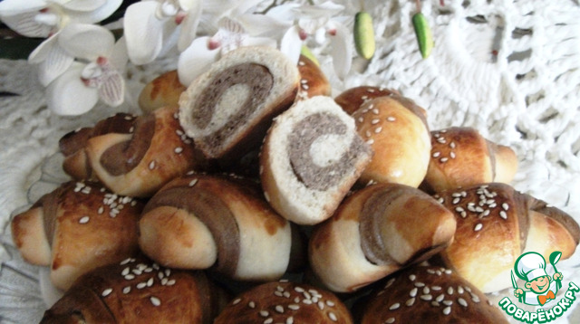 https://www.povarenok.ru/recipes/show/106747/ Двухцветные рогалики с кокосово-творожной начинкой. Великолепная выпечка, трудно устоять и не попробовать испечь! Вот только у меня без начинки и не такие красивые, как у Светочки, ну очень вкусные! Рогалики делала маленькими.