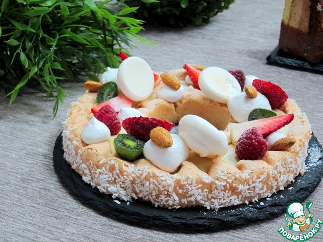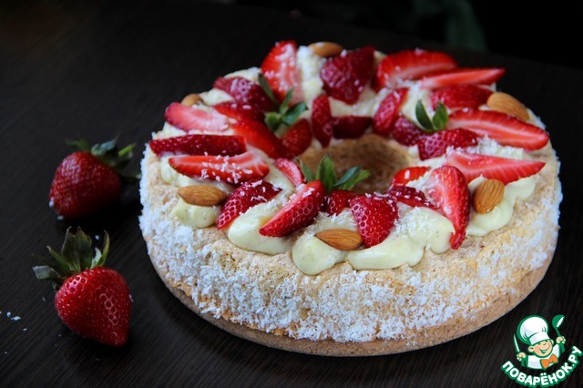 миндальный дакуаз и ванильный крем, украшен меренгой, ягодами. В моем исполнении выглядит проще ( на первой фотографии), но так же вкусен!