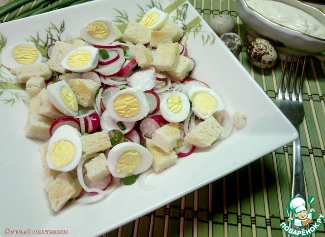 Салат с редисом, яйцом и крутонами. В салат я не добавляла свежий огурец (совсем его не ем) и лук у меня был только белый. Все остальное по рецепту. Скажу так: очень даже ничего. Интересная заправка, придала некую изюминку салату. Очень в тему тут крутоны, а яйца придали этому легкому салату сытности. Так что в целом все остались довольны. Спасибо Маше LapSha Maria.
