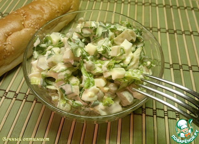 Салат с огурцами, зеленым горошком и яйцами. Салат простой в приготовлении, но вкусный. Делала с салатом Айсберг. Свежие огурцы заменила солеными. Думаю, что еще не раз его буду готовить. Спасибо Маше Eva Grimm.