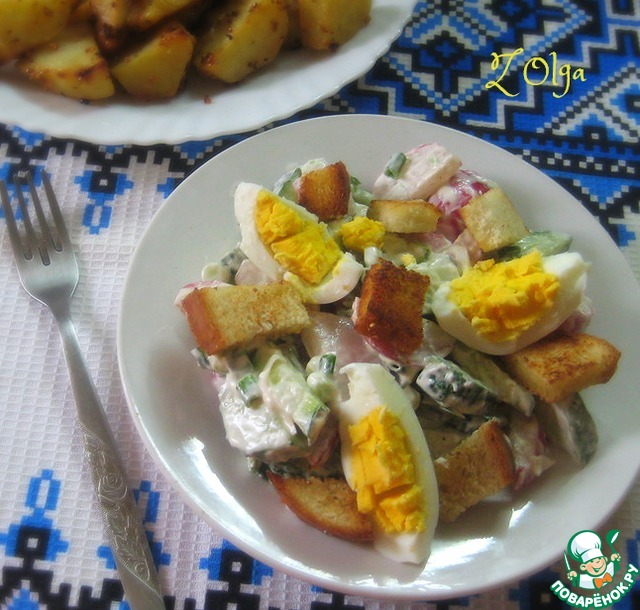 А к картошечке - легкий, весенний "Салат с редисом, яйцом и крутонами» по рецепту поваренка LapSha Maria https://www.povarenok.ru/recipes/show/72627/ У меня салатик с куриными яйцами и соус к нему добавляла сразу