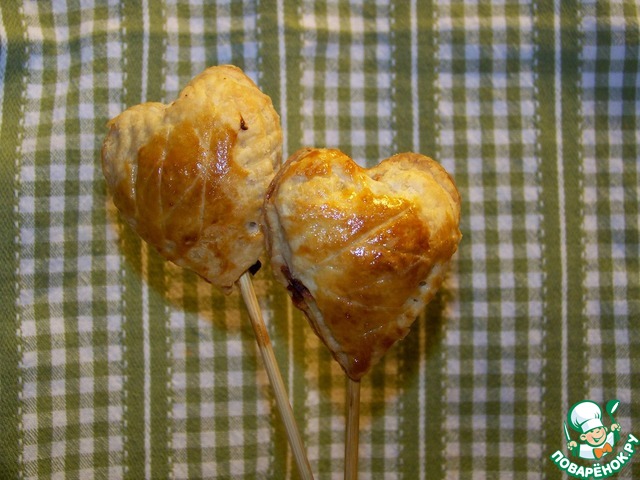 Пирожки на палочке от Сашеньки (Пулисян)https://www.povarenok.ru/recipes/show/106970/ Очень вкусные и оригинальной формы (у меня в виде сердечек,можно любую) с любой начинкой , у меня с куриным мясом (я мясоед!) Уверена понравятся и взрослым , и детям!Рекомендую!