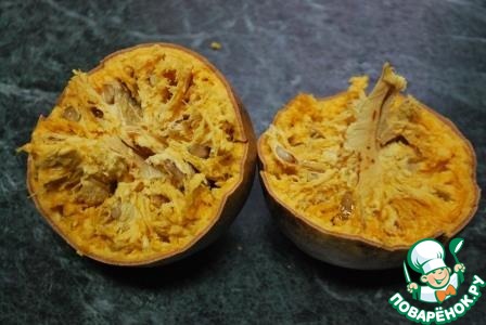 Для начала извлекаем ложкой всю мякоть и помещаем ее в миску.