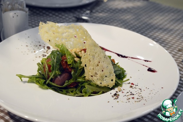 Салат с рукколой, вялеными томатами и чипсами из пармезана: