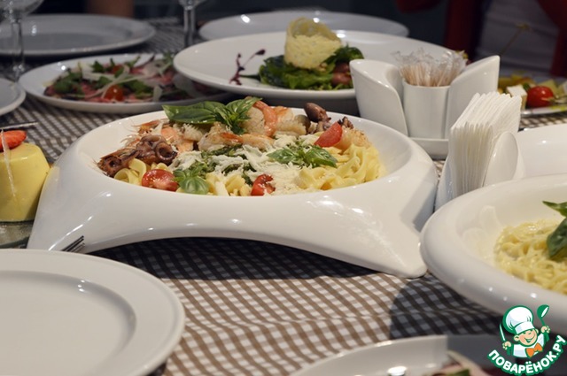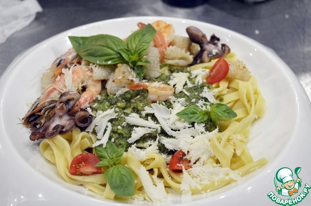 Паста с морепродуктами и соусом "4 сыра":