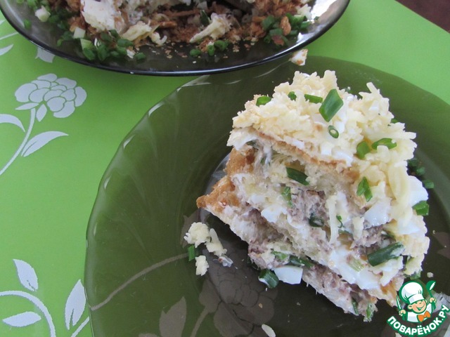 Закусочный торт с сайрой по рецепту Светланы (svetlanaboyko75) https://www.povarenok.ru/recipes/show/98308/