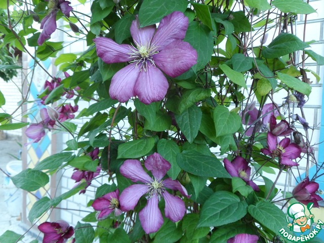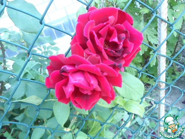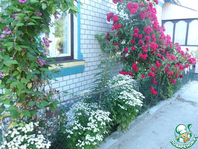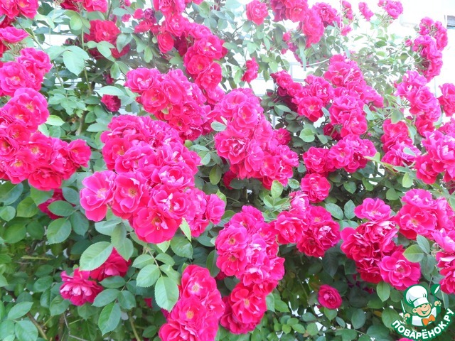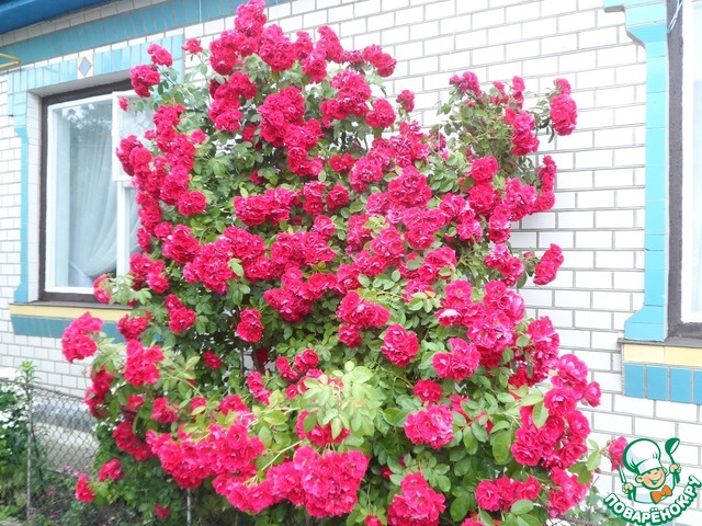 Этой плетистой розе с красивым названием "Симпатия" больше 25 лет.Практически каждый год радует нас своей красотой (ширина около 2 м, высота-больше 3м)