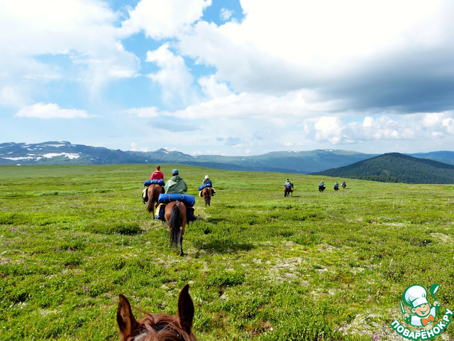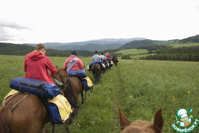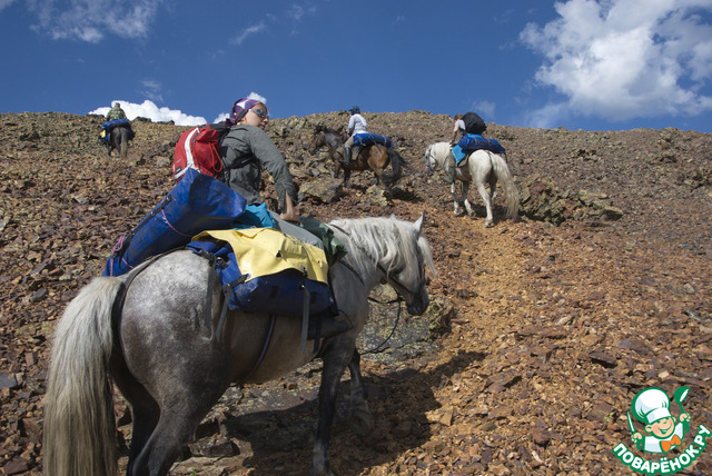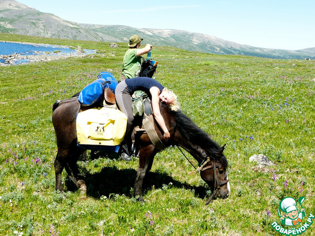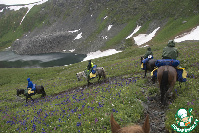 На обед – перекус из сух.пайка, чаще всего, банальные бутерброды. А вечером, независимо от того, насколько устал сам, будь добр, прежде всего позаботиться о коне, поставить палатку, помочь своим товарищам, если кто слабее и нуждается в помощи, приготовить поесть, а уж после этого можешь отдохнуть. Наверное, людям, привыкшим к комфорту, это кажется описанием ада) Но, поверьте, оно стоит того! Эти горы, эта дружба, эти песни у костра.