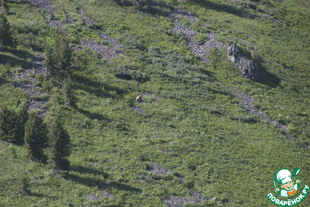 Проводя от 6 до 9 часов в седле ежедневно, невольно вспоминаешь переселения народов, как шли они в далеком прошлом, везя нехитрый скраб сквозь девственную природу. А природа там действительно не покорена: мы видели маралов, медведицу с медвежатами (слава Богу, на другом склоне!), а уж бурундуки! Эти милые зверьки обитали на каждой стоянке, видимо, четко зная, что где люди, там всегда найдется чем поживиться).