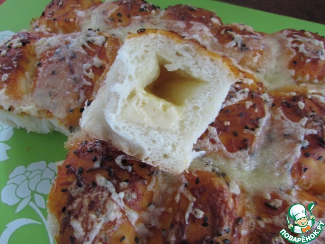Слов нет. Это очень вкусно. С тестом было очень приятно работать. Легкое, послушное. Начинка была только сырная. В следующий раз добавлю обязательно вяленых помидорчиков. За минуту до готовности посыпала еще сверху брынзу, поэтому у меня шарики в пене получились!!!