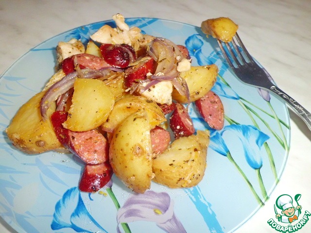 "Картофельная сковорода с курицей и колбасками"