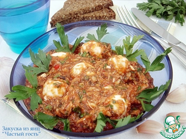 Закуска из яиц "Частый гость" удивила своим богатым,насыщенным вкусом!Вместо сахара для маринада я использовала мед акации.Достаточно сытно и так много получилось!Очень удобно баночку с готовой