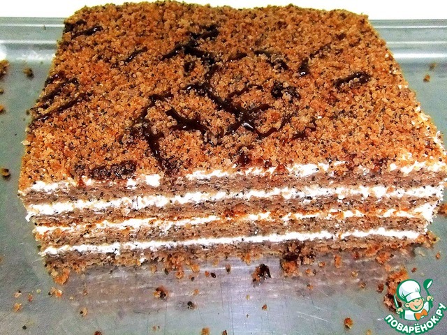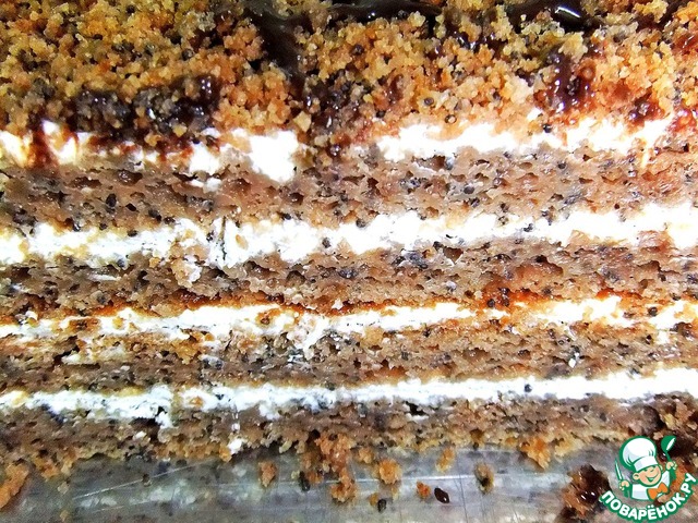 Нежный маковый торт - от natapit очень понравился! Я правда, еще меду немного добавила, поэтому цвет бисквита потемнее вышел. И сверху крошкой посыпала.