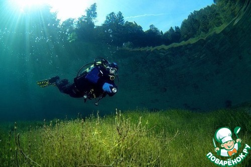 Водолаз плавает в кристально чистом озере Самерангер в Тироле, Австрия. Фотография была сделана на глубине 3 м: