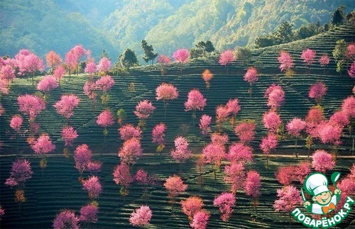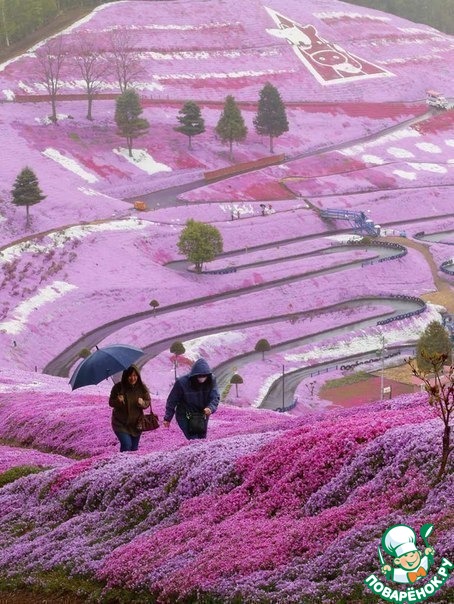 Весенние цветы на склоне холма, Хоккайдо, Япония: