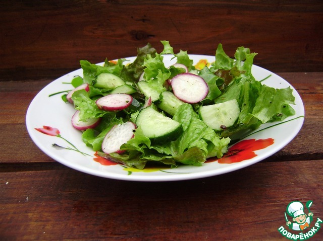 Очень вкусный и свежий салатик. Салат добавила свой с огорода.