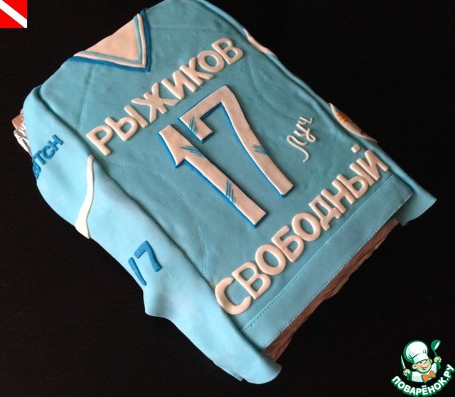 Торт в виде хоккейной майки для мальчика-хоккеиста. На другом рукаве нарисованный на мастике шеврон, но вот фото , к сожалению, у меня не сохранилось