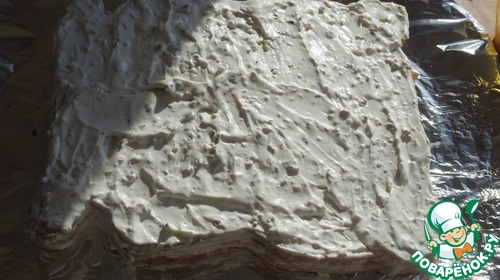 Крем сметанный , пересыпала орехами. Крема брала мнооого чтоб наверняка пропитался