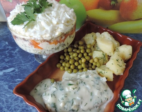 Салат из терпуга горячего копчения и красная треска под яичным соусом с молодой вареной картошечкой и зеленым горошком.