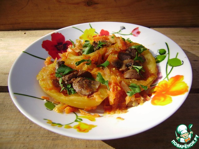 Очень вкусная и красивая картошка. Решила себе упростить жизнь и проварила картошку до полуготовности. Легче было вынимать серединку и тушилась она меньше времени.