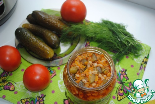 Далее добавляем отварную перловку и зелень,доводим до кипения и раскладываем по простерилизованным банкам.Пастеризуем наши баночки 30 мин.Выход 3,5 л.