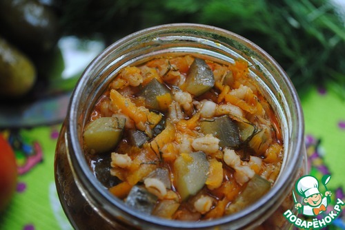 Морковь трем на крупной терке,лук режем как в суп -обжариваем до мягкости,огурцы режем кубиками,добавляем в пережарку,тушим 20 мин.