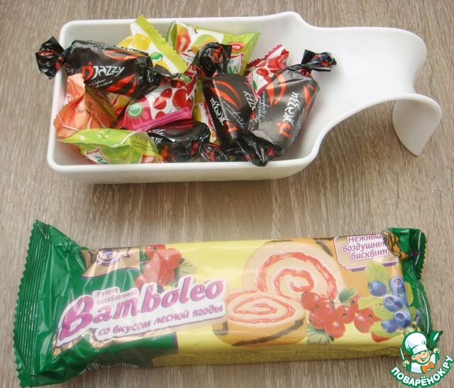 Чудесный салатник замечательной формы - просто мечта!Вкуснейшие шоколадные конфеты с нугой,ягодные желе в шоколаде и нежнейший бисквитный рулет.