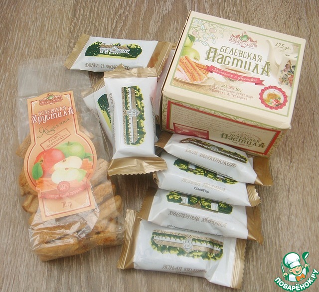 Любимейшая белевская пастила,да еще и с брусникой,белевская хрустила,оторваться от которой просто невозможно,и обожаемые мной конфеты суфле в шоколаде "Ясная поляна".