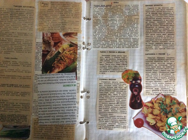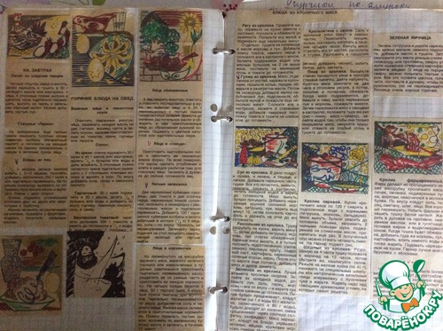 ) и с железным замком, скрепляющим листы. Во как! И стала я в эти тетради (первые-вторые блюда-напитки и для выпечки) записывать рецепты, вклеивать вырезки из газет/журналов с рецептами, а заодно и украшала картинками/рисунками, чтобы не скучно было читать